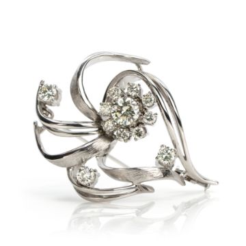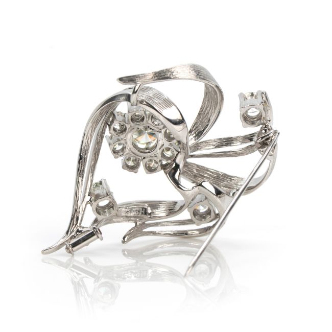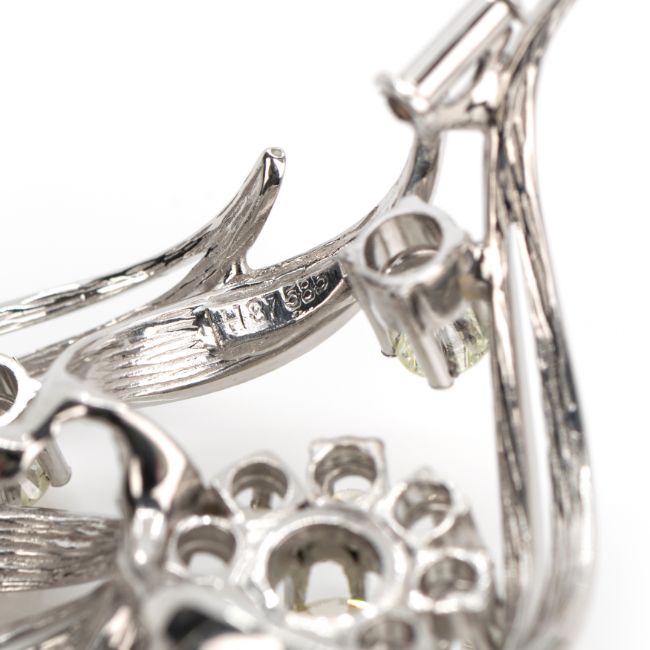 585 Weißgold, punziert, 12 Diamanten im Brillantschliff, gesamt ca. 1,65 ct, zentraler Diamant K-L, die übrigen I-J, vs-si, Länge 4,5 cm, Breite 3,5 cm, Gewicht ca. 13,2 g