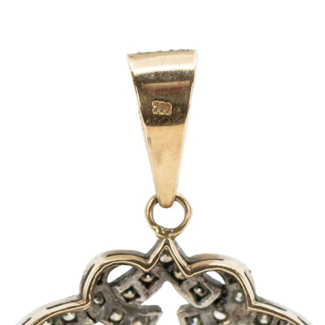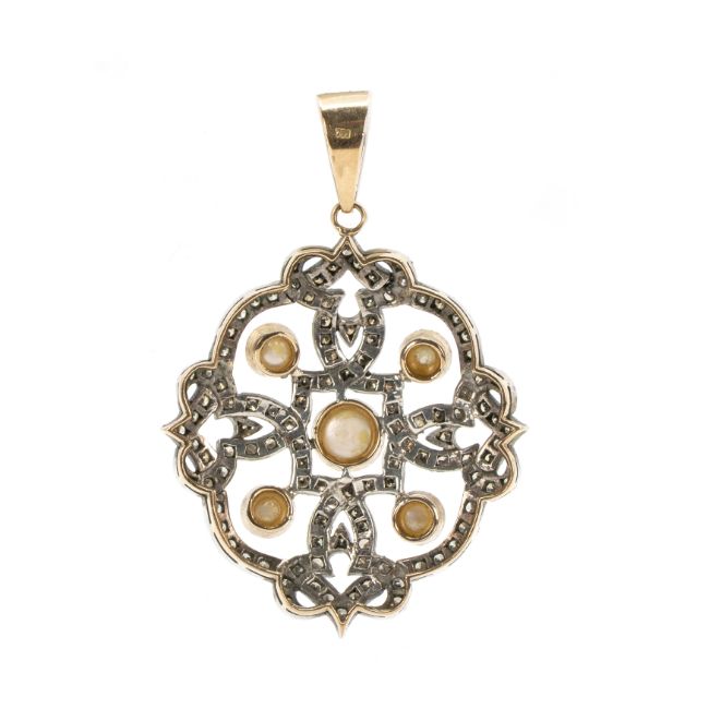 750 Gelbgold, punziert und Silber, geprüft, ca. 115 Diamanten im Brillant- und Achtkantschliff, gesamt ca. 1,15 ct, J-N, 5 Halbperlen, Ø 4,5 - 6,3 mm, Länge 5,3 cm, Breite 4 cm, Gewicht ca. 10,9 g