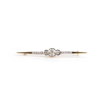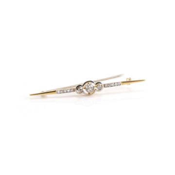 750 Gelb- und Weißgold, punziert, 3 Diamanten im Altschliff und 13 Diamantrosen, gesamt ca. 0,70 ct, H, vs-pi, Länge 7,5 cm, Gewicht ca. 5,2 g