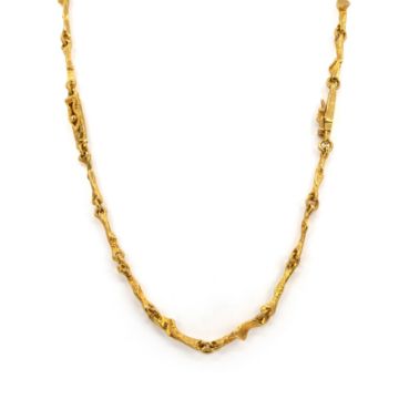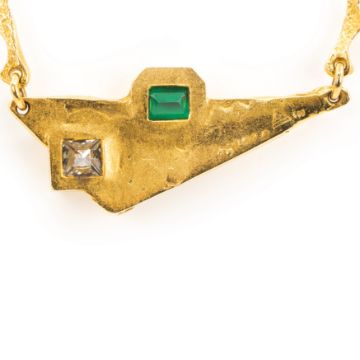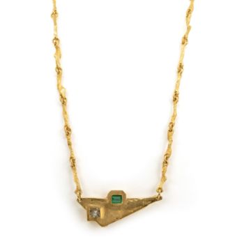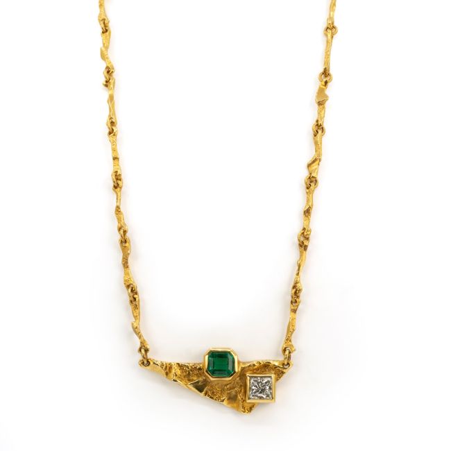 Björn Weckström (1935) für Lapponia, Finnland, 750 Gelbgold, punziert, dazu Markenpunze, Jahrespunze P8, ein Diamant im Prinzessschliff, 1,77 ct, if, H, ein Smaragd im Smaragdschliff, ca. 1,35 ct, Länge 62 cm, durch 2 Verschlusselemente auch in der Länge 47 cm tragbar, Gewicht ca. 33,5 g, HRD Zertifikat zum Diamanten von 1991 anbei