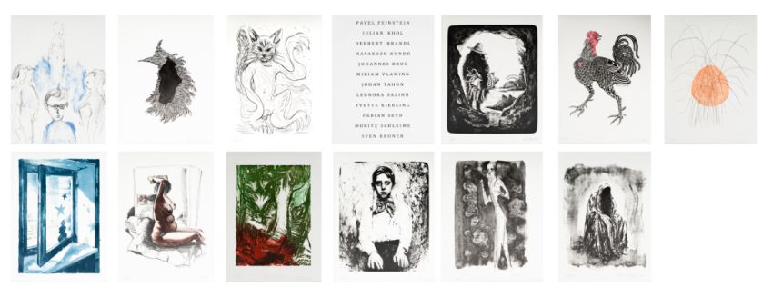 12-tlg., Grafiken auf Zerkall Bütten, 58 cm x 41,5 cm Blattmaß, beteiligte Künstler*innen: Herbert Brandl, Pavel Feinstein, Julian Khol Masakazu Kondo, Johannes Brus, Miriam Vlaming, Johan Tahon, Leunora Salihu, Yvette Kießling, Fabian Seyd, Moritz Schleime, Sven Kroner, jeweils signiert und 70/100 nummeriert, nur Herbert Brandl 70/113 nummeriert, teilweise 2017 oder 2016 datiert, die Grafik von Yvette Kießling mit 'Jungle, Sansibar' betitelt