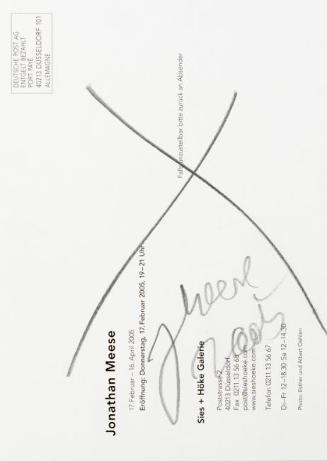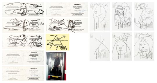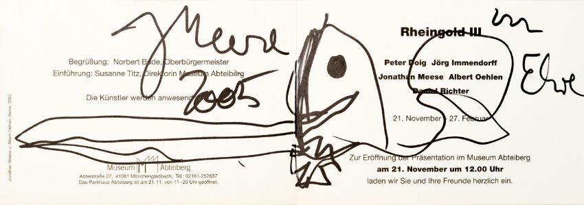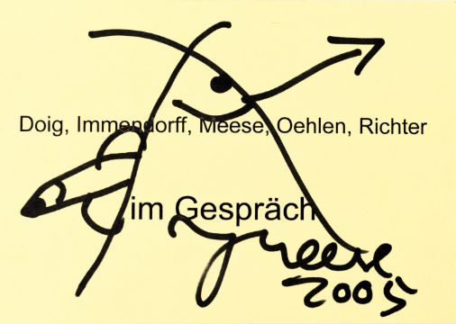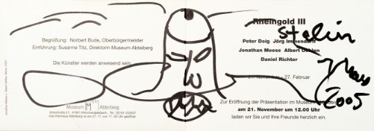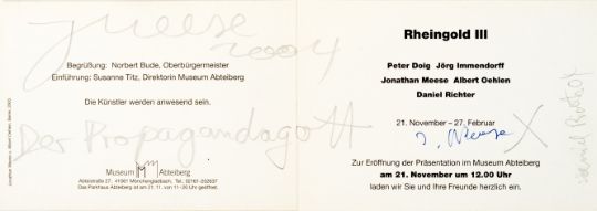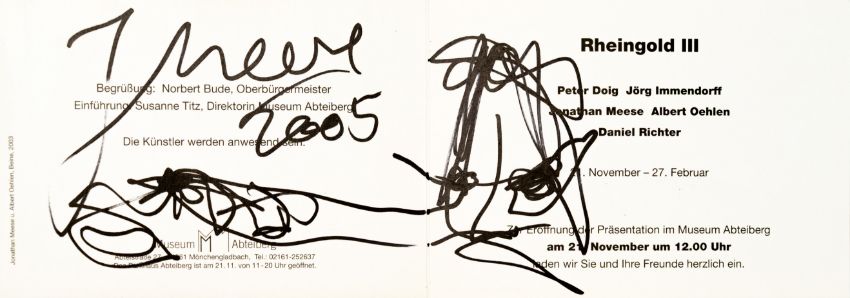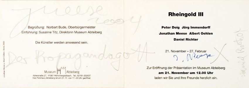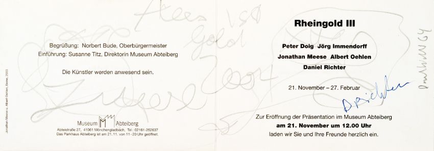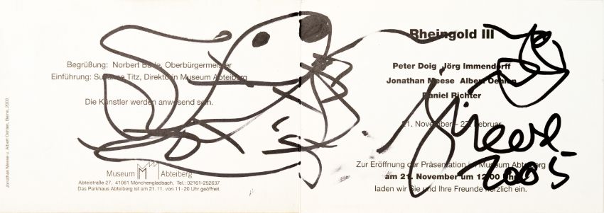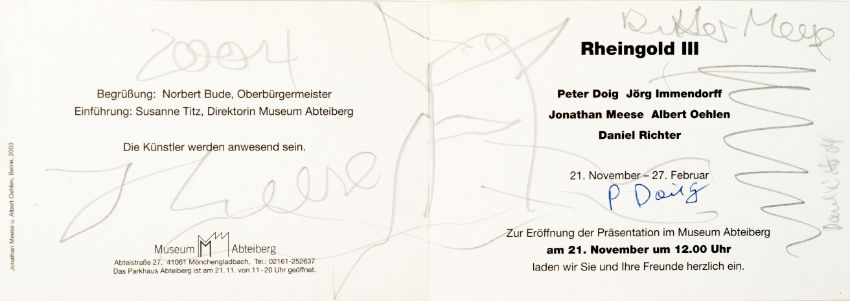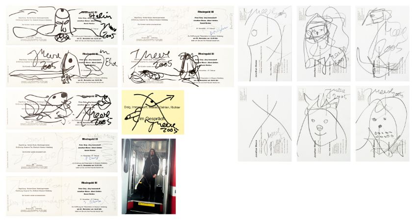15-tlg., Konvolut an Ausstellungseinladungen und -flyern mit Skizzen und Künstlersignatur, 10x Bleistift auf festem Papier, 5x Edding auf festem und leichtem Papier, 7x 10,5 cm x 30 cm Blattmaß, 7x 17,5 cm x 12,7 cm Blattmaß und 1x 10,5 cm x 15 cm Blattmaß, jeweils signiert, einmal signiert von Peter Doig, zweimal signiert von Daniel Richter, partiell minimal berieben