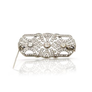 Frankreich, wohl Import aus Russland, 750 Weißgold, punziert, 3 Diamanten im Altschliff und ca. 130 Diamanten im Rosenschliff, die 3 zentralen Diamanten, gesamt ca. 2,30 ct, die übrigen Diamanten ca. 2,50 ct, insgesamt ca. 4,80 ct, I-N, pi1-pi2, Länge 5,7 cm, Breite 2,7 cm, Gewicht ca. 15,9 g