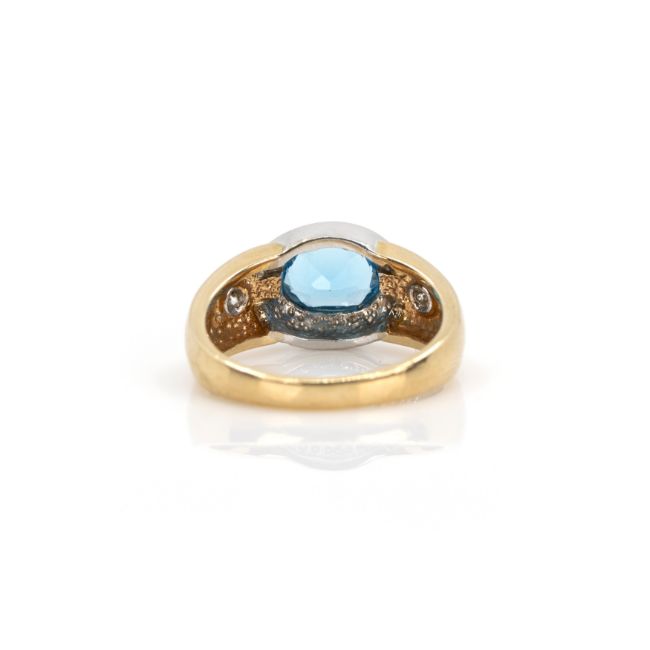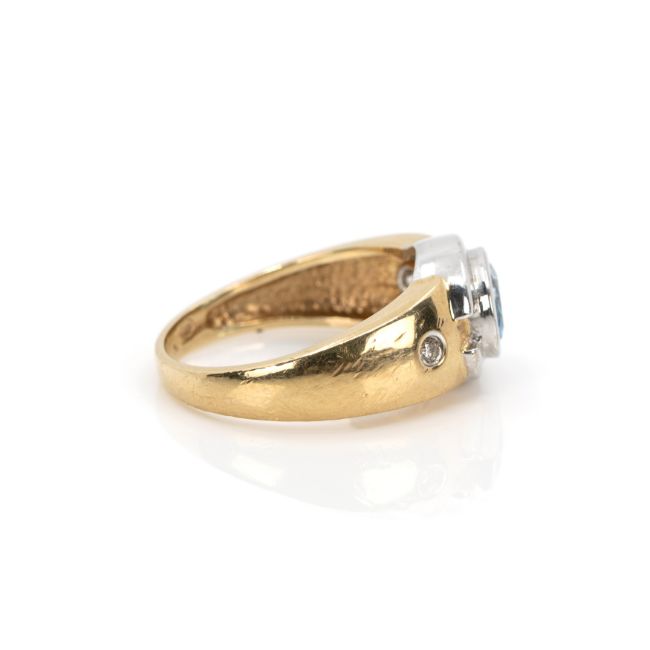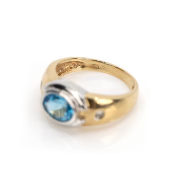 585 Gelb- und Weißgold, punziert, 2 Diamanten im Brillantschliff, H, vs, ovaler, facettierter Blautopas, ca. 1,50 ct, RW 56, Gewicht ca. 4,6 g, Ringschiene mit Tragespuren
