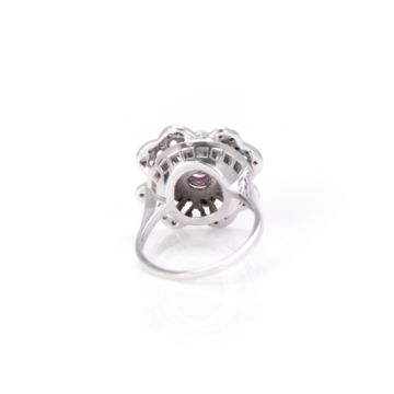 750 Weißgold, geprüft, Diamanten im Achtkantschliff, gesamt ca. 0,50 ct, H, vs-si, zentraler, rund facettierter Rubin, ca. 0,50 ct, RW 56, Gewicht ca. 7,8 g