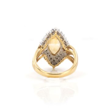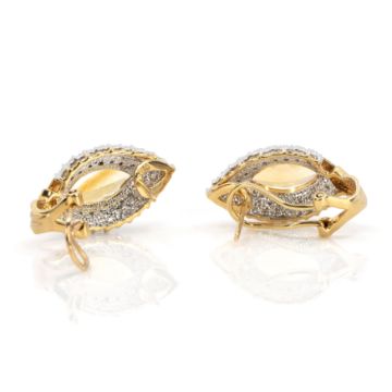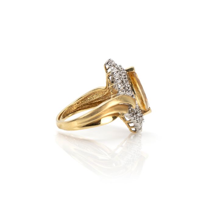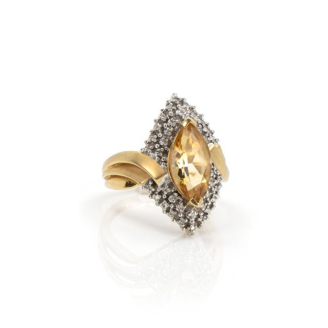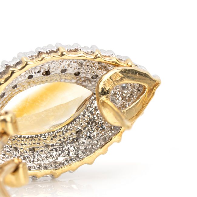 3-tlg., 750 Gelb- und Weißgold, punziert, Ohrclips mit insgesamt 84 Diamanten im Achtkantschliff, gesamt ca. 0,84 ct und 2 Citrinen im Marquiseschliff, gesamt ca. 4,80 ct, Ring mit 38 Diamanten im Achtkantschliff, gesamt ca. 0,38 ct und einem Citrin im Marquiseschliff, ca. 2,65 ct, Länge Clips 2,7 cm, RW 54, Gesamtgewicht ca. 21,6 g