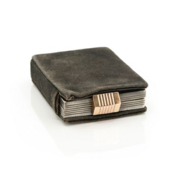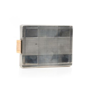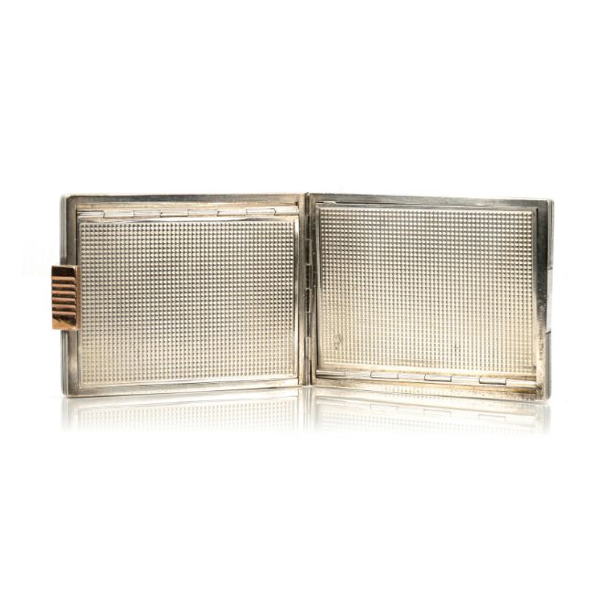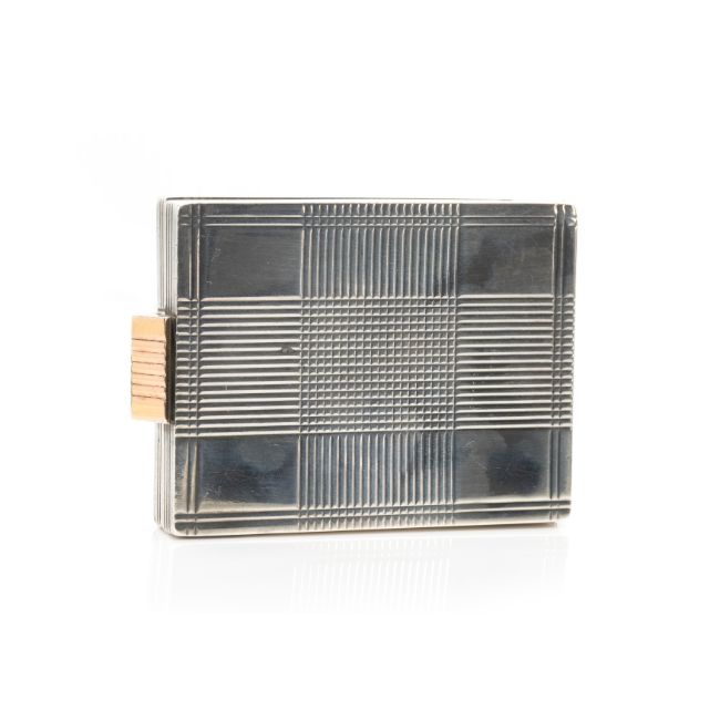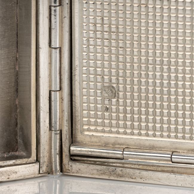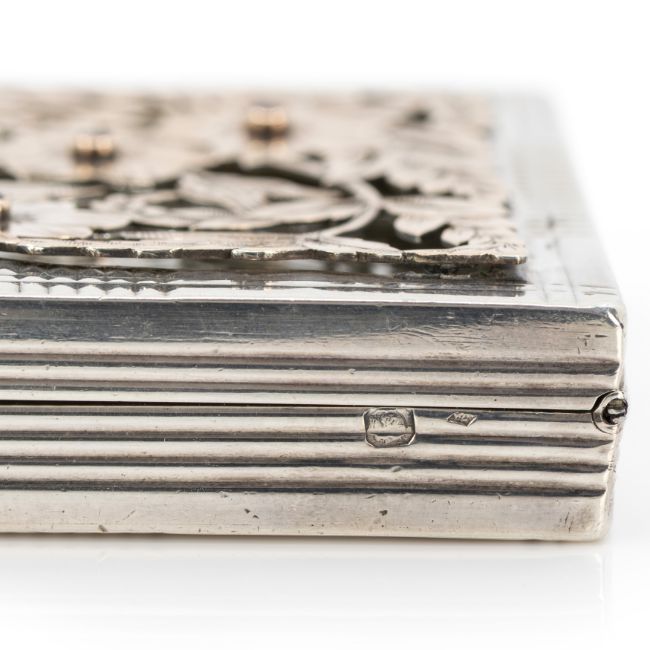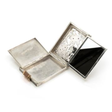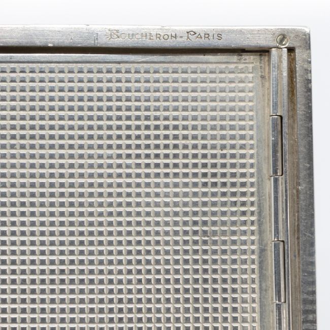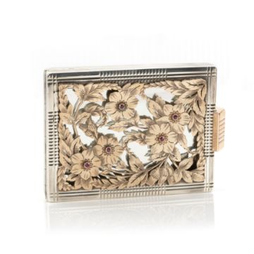 Paris, um 1940, 950 Silber, punziert, Minervakopfmarke, dazu bezeichnet 'Boucheron-Paris', aufgesetzte Blütenverzierung Gold, 5 kleine Rubine, inseitig zwei Klappdeckel, 1 Spiegel, 8,3 x 5,7 x 1,2 cm, Gewicht ca. 160 g, Schutzkassette anbei, Sprungmechanismus eines Klappdeckels innen hakt