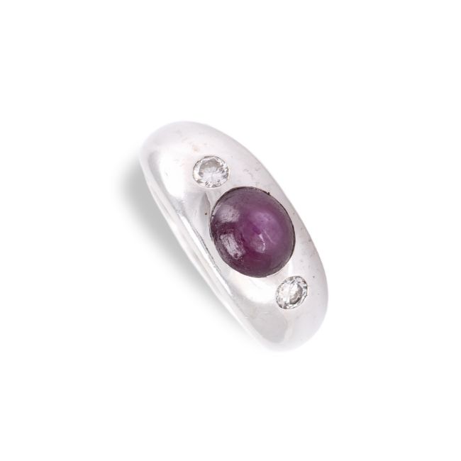 585 Weißgold, punziert, 2 Diamanten im Brillantschliff, gesamt ca. 0,15-0,20 ct, I-J, vs, zentraler Sternrubin im Cabochonschliff, ca. 1,20 ct, RW 59, Gewicht ca. 10 g, Ring mit leichten Tragespuren