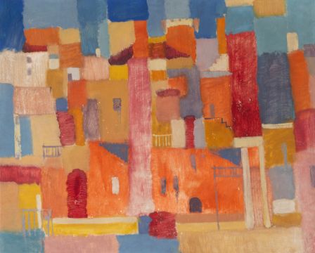 Mediterrane Stadtansicht, Mischtechnik Papier auf Spanholzplatte aufgezogen, 48 cm x 59,5 cm Werkmaß, monogrammiert, 61 datiert, Papier vollflächig verklebt, partiell Farbverluste, Provenienz: direkt beim Künstler erworben