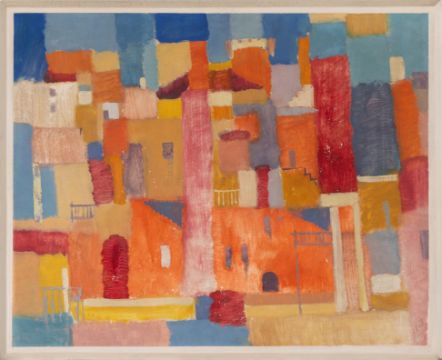 Mediterranean city view, mixed media paper mounted on chipboard, 48 cm x 59.5 cm work size, monogrammed, 61 dated, paper glued over the entire surface, partial color losses, provenance: acquired directly from the artist
