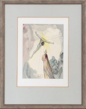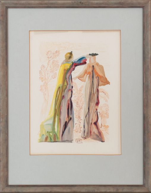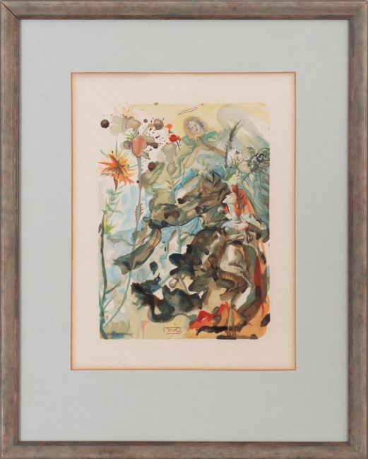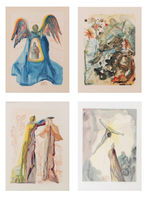 vier Motive aus La Divina Commedia, Lithographie, Bildgröße 24,5-25 × 18 cm, Blattgröße 33 × 26 cm, im Druck signiert, lichtbedingt vergilbt oder verdunkelt, mit einhergehenden Abzeichnungen am Passepartout, auf einem der Blätter verstärkt, partiell minimal fleckig, 1960 datiert