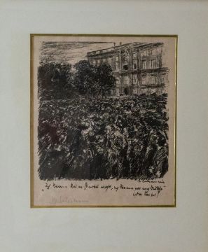 Künstlerflugblatt zum Beginn des Ersten Weltkriegs, Lithographie, 31 × 26 cm (Passepartoutausschnitt), im Druck signiert und betitelt "Ich kenne keine Parteien mehr, ich kenne nur noch Deutsche (der Kaiser)", zusätzlich von Hand signiert, 1914 datiert, unter Passepartout gerahmt, nicht geöffnet